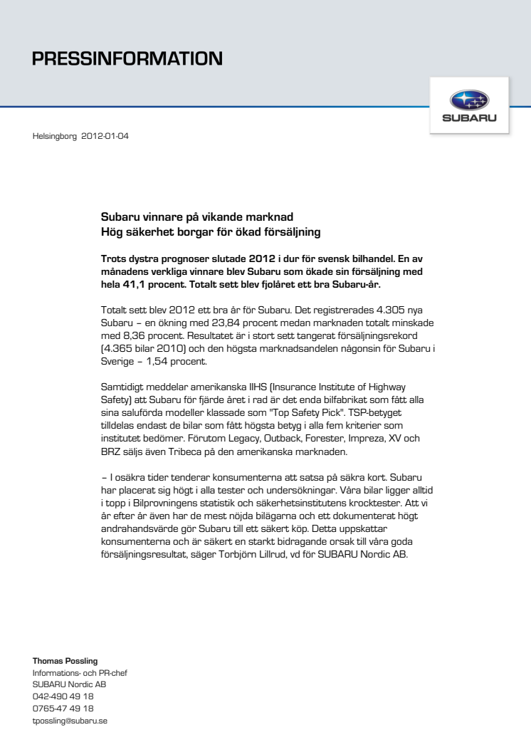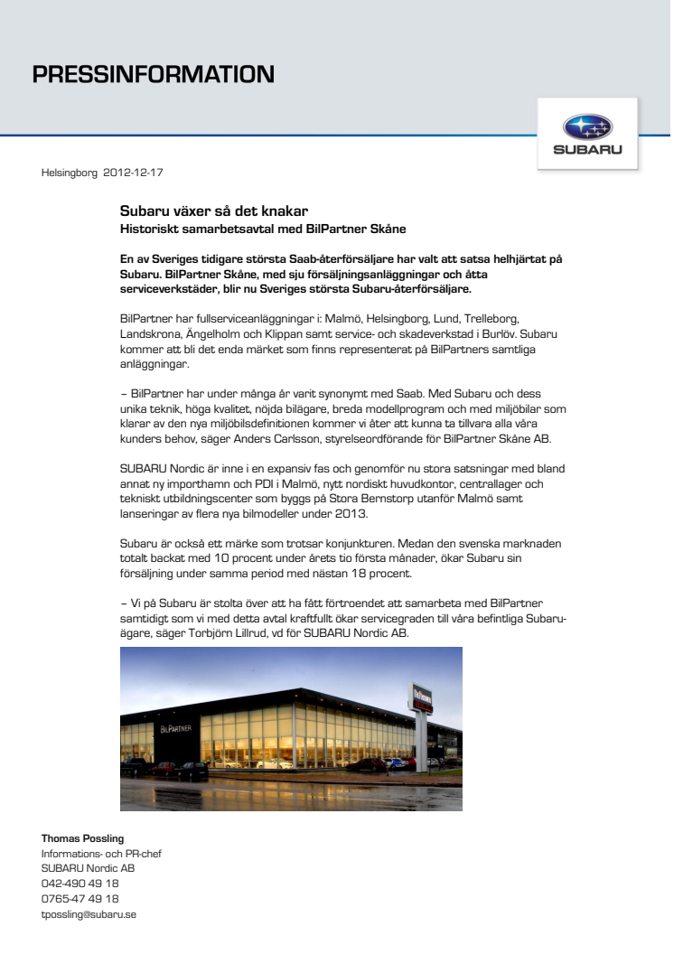SUBARU Nordic tecknar historiskt samarbetsavtal med BilPartner Skåne