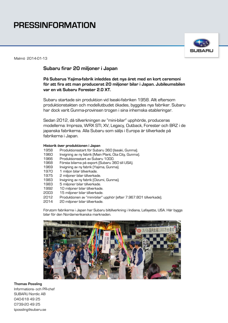 Subaru firar 20 miljoner i Japan