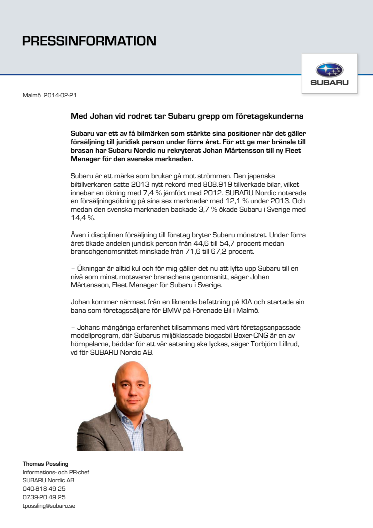 Johan Mårtensson är ny Fleet Manager på Subaru Nordic